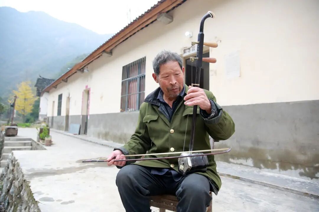 (拉二胡的熊明进)熊明进今年75岁,是一个五保户。几年前还住在半山腰,房屋摇摇欲坠,又没有左邻右舍,一个人非常的孤单寂寞。山路难行,从他的老屋到如今的安置房,一趟下来就要两个小时,更不用说到镇上买米买油,非常的不方便。有一年老熊病了,村支书听说后,请了几个小伙上山去抬老熊下山看病,老熊的病倒是好了,可是硬生生地却把几个小伙累趴下了。于是坚决地把老熊劝下山来,这不,下了山,老熊的精神愉快了,重新把当年的二胡手艺捡起来了。扶贫工作队锦上添花,给老熊送来了二胡。瞧瞧现在的老熊越活越精神,越活越有滋味。