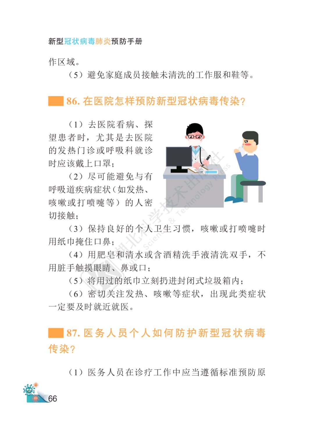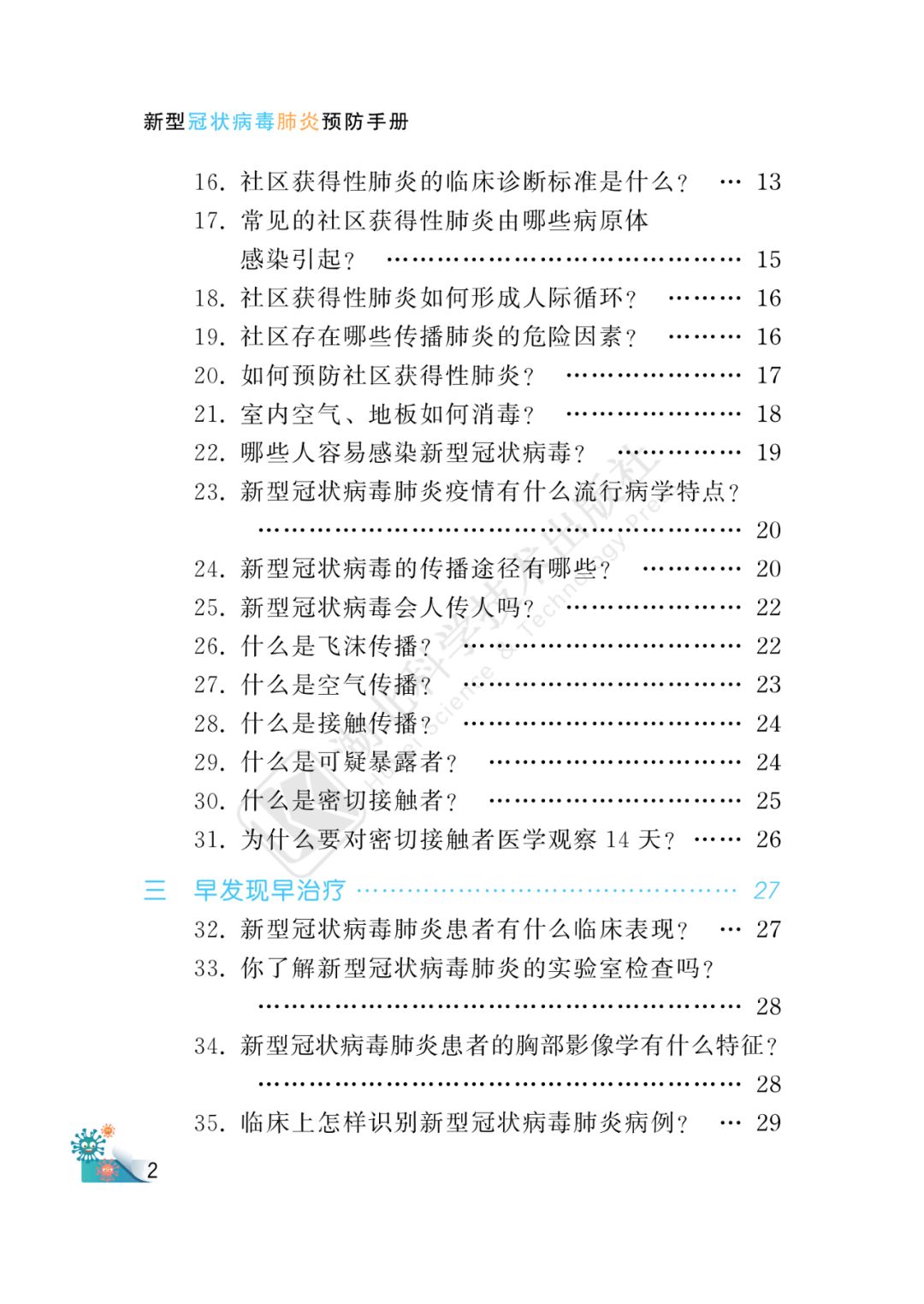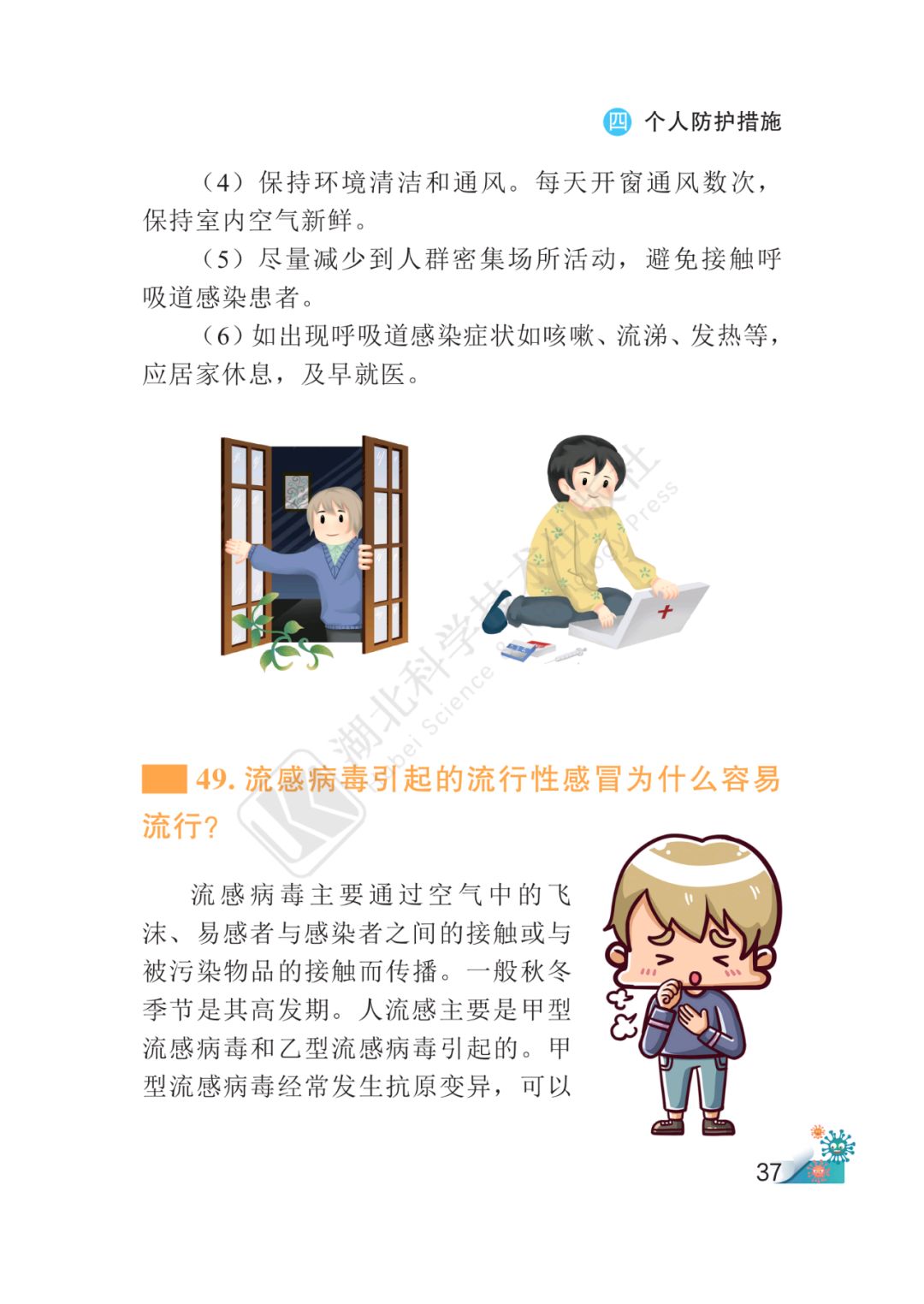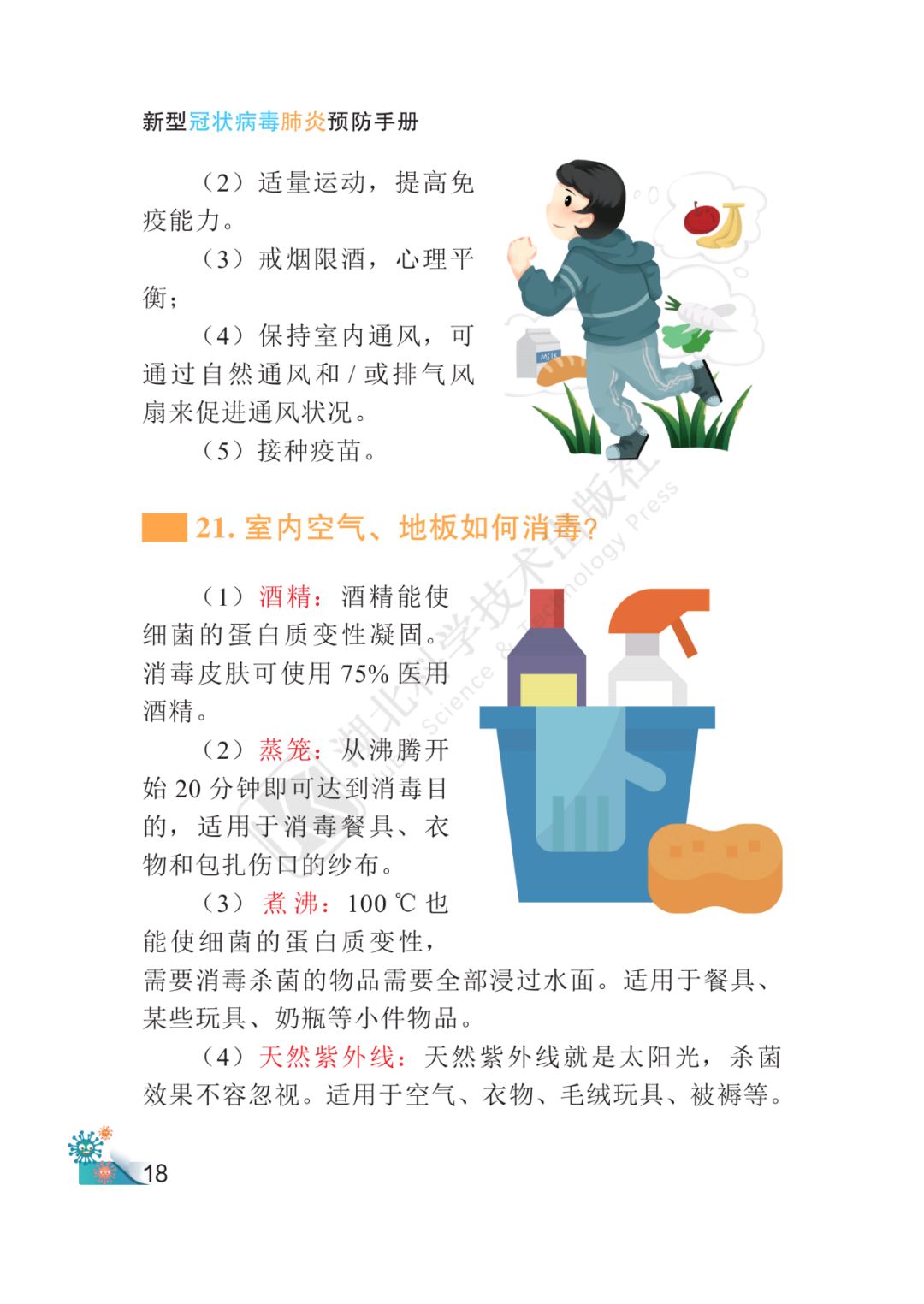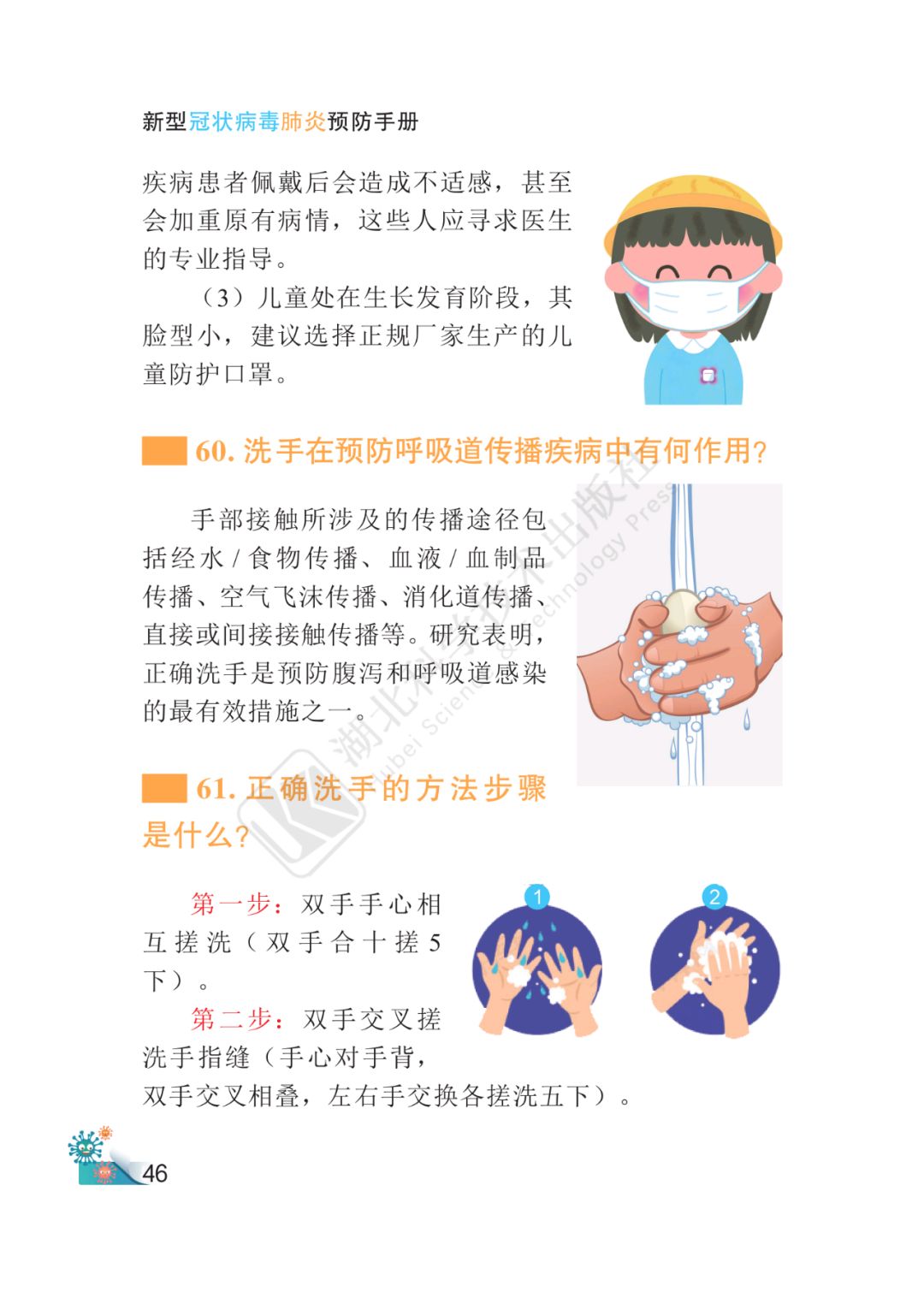 “我们向全国读者奉上全书电子版,供大家免费阅读,目的是为了增进大众及有关专业人员对这一新型疾病的认识和理解,指导个人预防,降低传播风险。” 据湖北科学技术出版社社长王力军介绍,该书内容分为认识冠状病毒、理解传播风险、早发现早治疗、个人预防措施、场所卫生要求和传染病相关知识等六部分,以图文并茂、通俗易懂的表达方式,为大众解答在抗击新型冠状病毒肺炎过程中的疑惑。