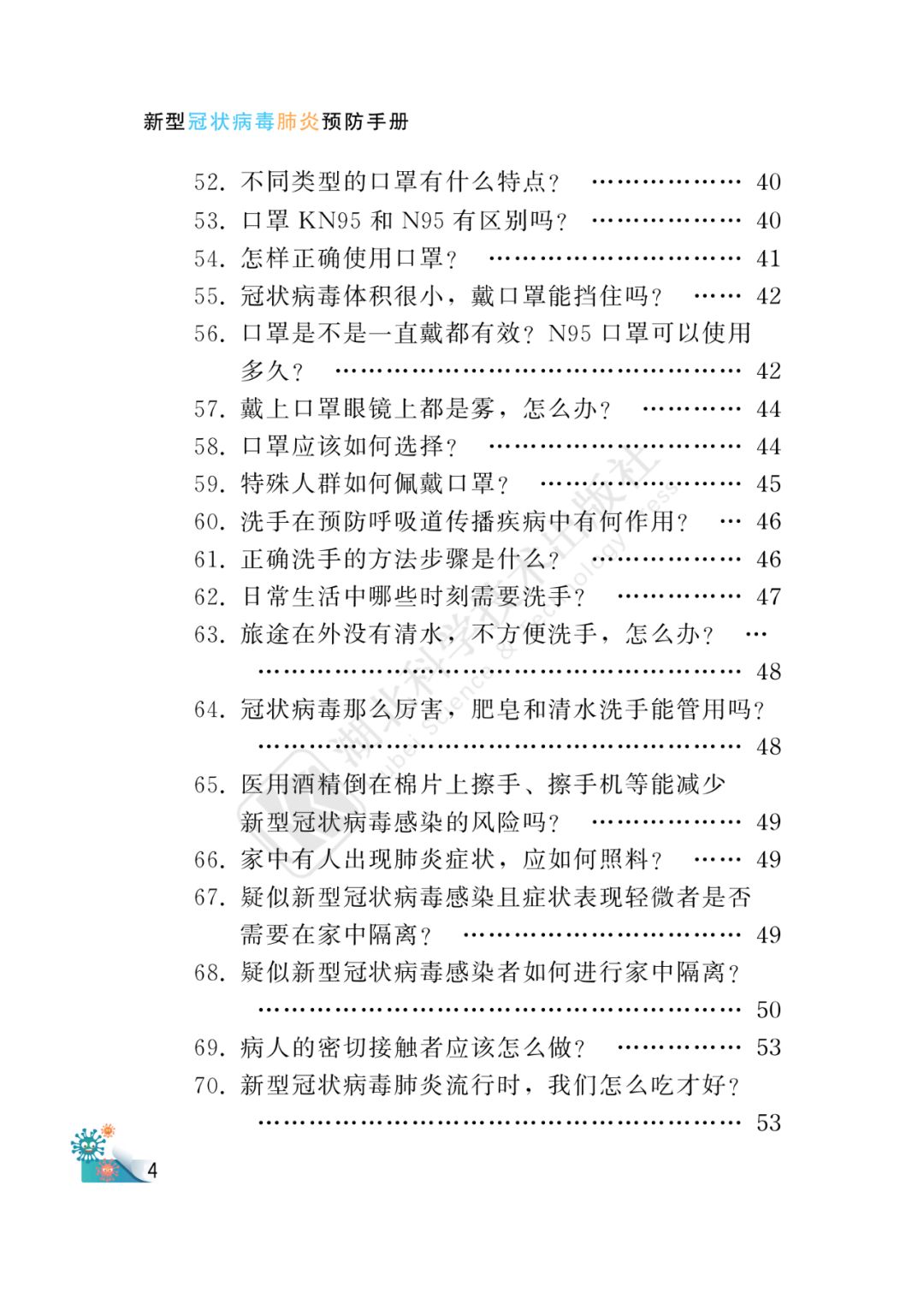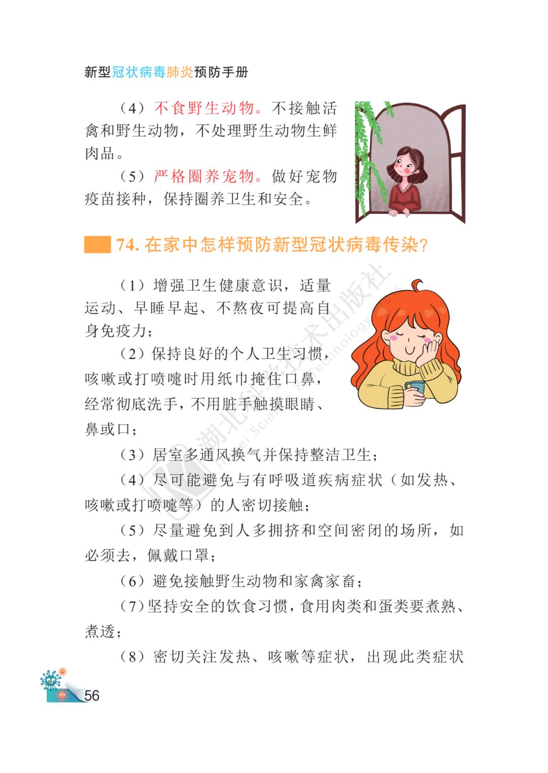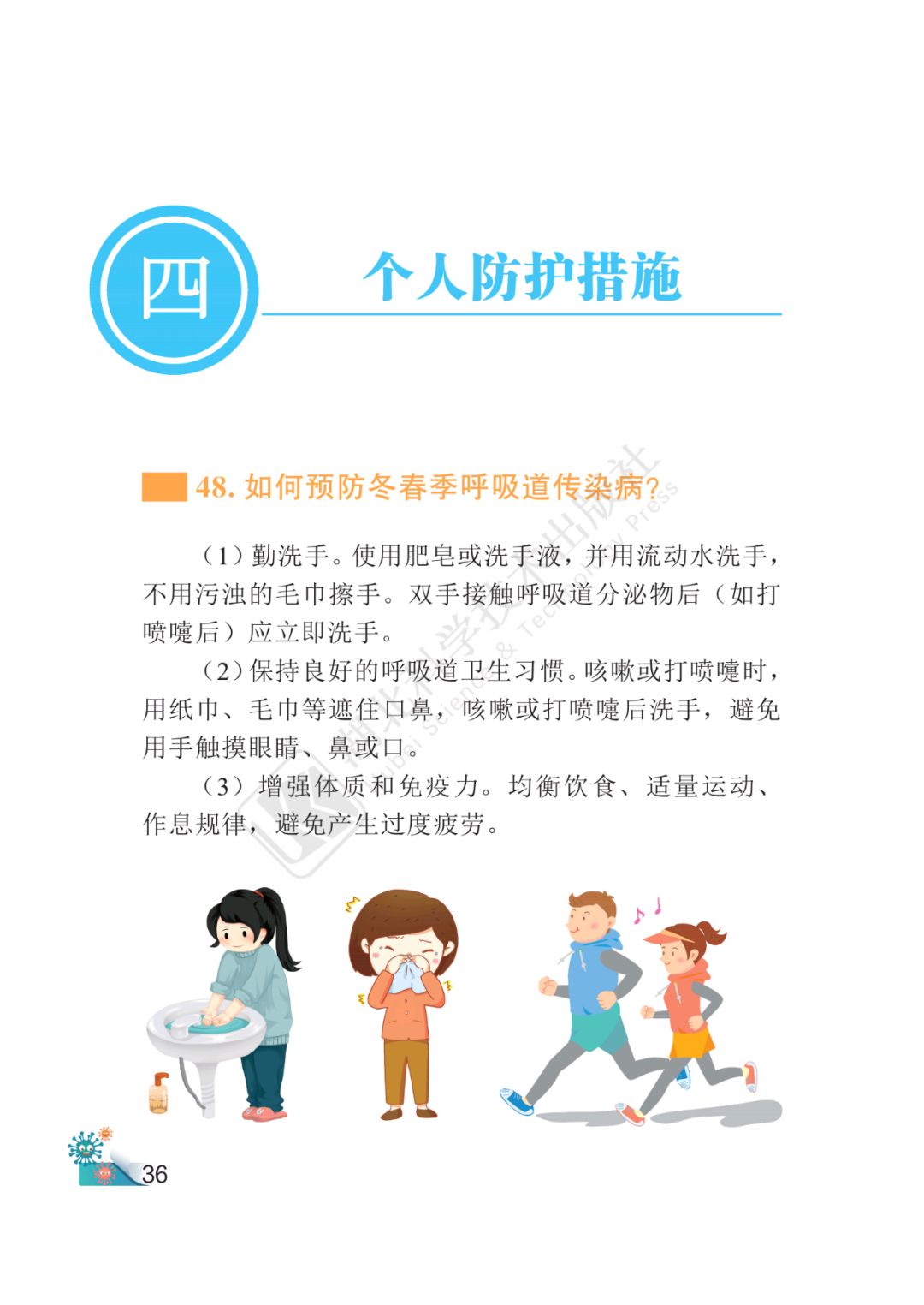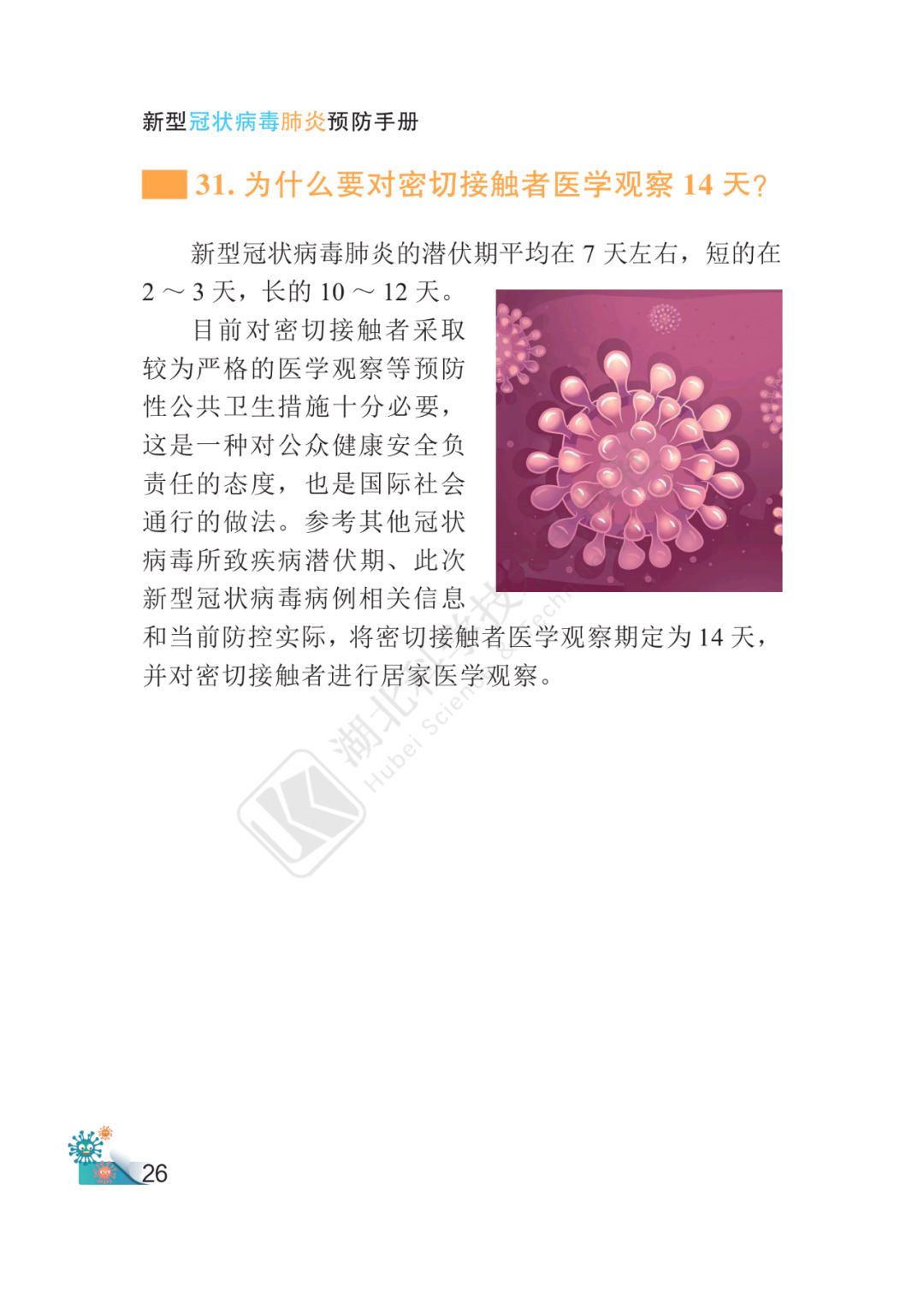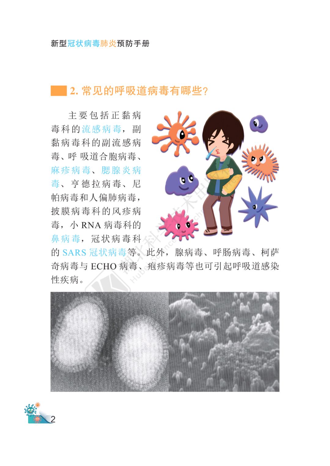 “我们向全国读者奉上全书电子版,供大家免费阅读,目的是为了增进大众及有关专业人员对这一新型疾病的认识和理解,指导个人预防,降低传播风险。” 据湖北科学技术出版社社长王力军介绍,该书内容分为认识冠状病毒、理解传播风险、早发现早治疗、个人预防措施、场所卫生要求和传染病相关知识等六部分,以图文并茂、通俗易懂的表达方式,为大众解答在抗击新型冠状病毒肺炎过程中的疑惑。