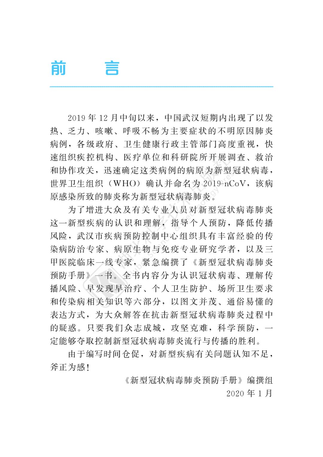 前不久,《中国新闻出版广电报》记者从湖北科学技术出版社获悉,该社联合武汉市疾病预防控制中心,组织了一批经验丰富的专家学者和三甲医院临床一线医护人员,紧急策划编撰了《新型冠状病毒肺炎预防手册》一书。用一本小书,让来自湖北出版人的关爱,伴随读者一起,等待黎明,等待春天。