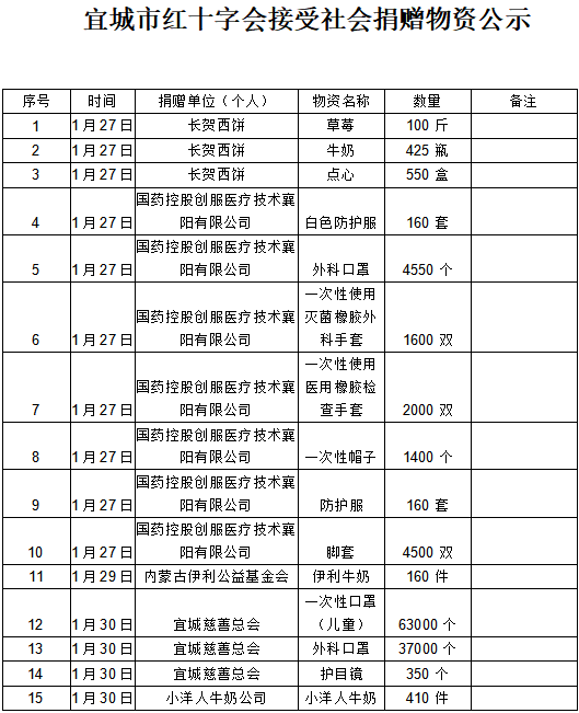 自新型冠状病毒感染的肺炎疫情发生以来,社会各界纷纷踊跃捐款捐物,积极支持宜城疫情防控工作,体现了社会大爱和守望相助的精神。截止2020年1月31 日,宜城市红十字会共接受社会各界爱心企业人士捐赠的抗击新型冠状病毒感染的肺炎专项资金110400元,以及社会各界爱心人士捐赠的食品和医疗防护用品。市红十字会本着公开、透明、高效的原则,24小时为各界爱心人士服务,所接受的款物交由市防控指挥部统一调配使用,欢迎社会各界进行监督。现将捐赠公示如下:
