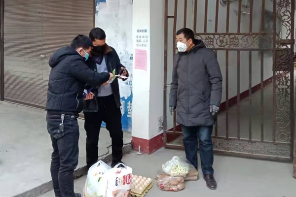 2月3日,人社局防控疫情专班帮助座垫厂武汉返宜居家自我隔离人员买菜,并送菜上门。