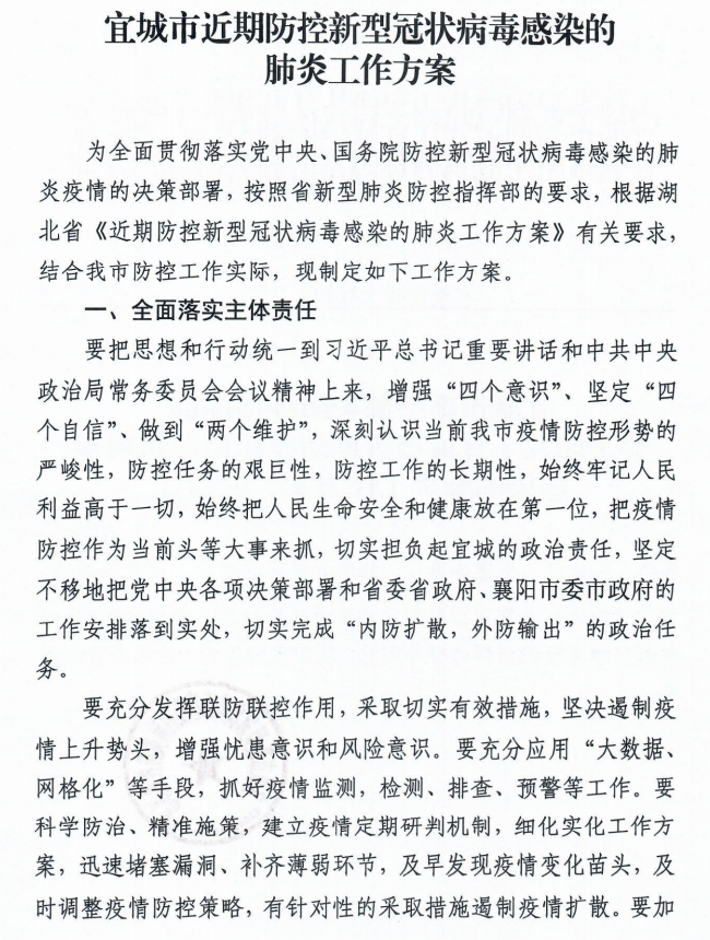 宜城市新型肺炎防控指挥部关于印发《宜城市近期防控新型冠状病毒感染的肺炎工作方案》的通知