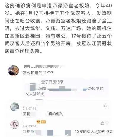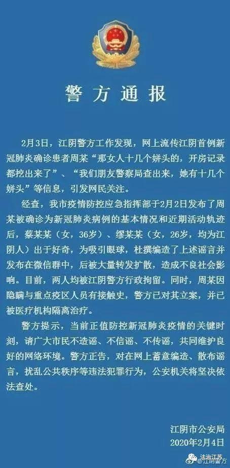 @江阴市公安局发布通报,2月3日,江阴警方工作发现,网上流传江阴首例新冠肺炎确诊患者周某“那女人十几个姘头的,开房记录都挖出来了”、“我们朋友警察局查出来, 她有十几个姘头”等信息,引发网民关注。