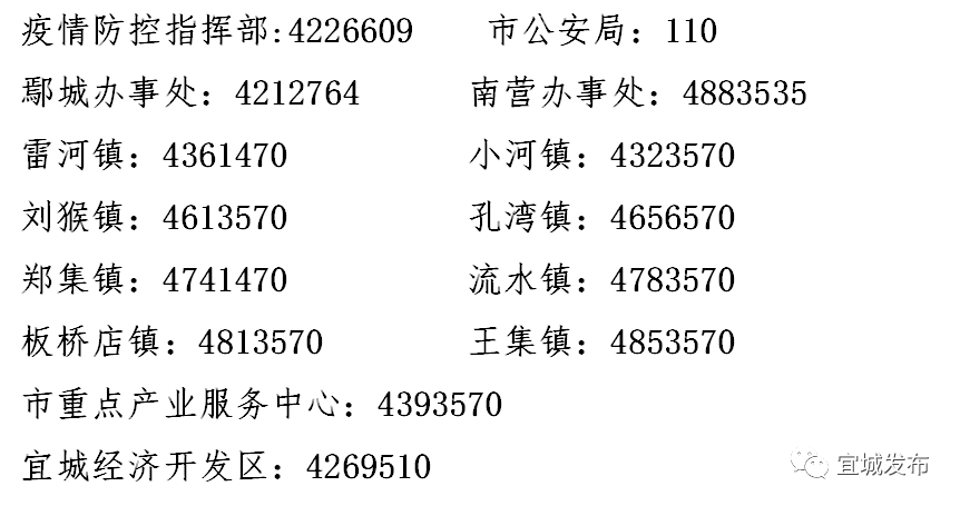 为深入贯彻党中央、国务院关于新型冠状病毒感染肺炎(简称“新型肺炎”)防控工作决策部署,认真落实省委、市委相关要求,最大限度阻断疫情传播渠道,落实群防群控措施,有效形成疫情防控合力,经宜城市新型肺炎防控指挥部研究决定,从即日起,凡举报1月18日以来没有登记的武汉返宜人员和违反禁令操办红白事酒席、聚会、聚餐、打麻将等聚集活动的线索,一经查证属实后,市新型肺炎防控指挥部给予每次50元的奖励。举报电话如下: