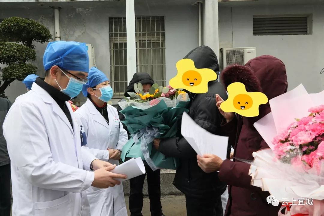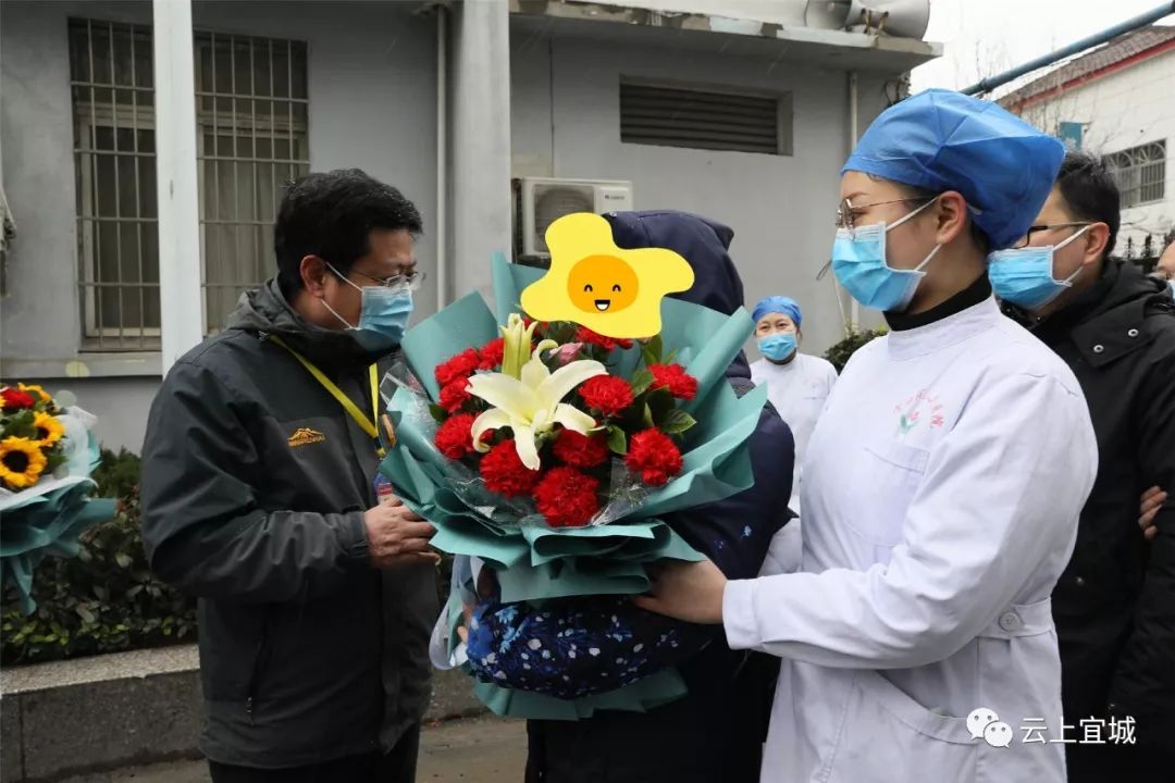 宜城市副市长金德安和市人民医院感染科医护人员向他们献上了鲜花致以祝福,叮嘱他们回家后居家观察的注意事项。接过鲜花后,5人热泪盈眶,都纷纷将鲜花转送给精心照顾他们的医护人员。