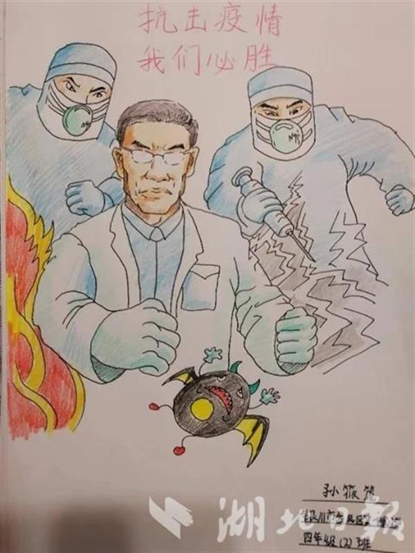 来自银川市、邯郸市、四川省甘孜藏族自治州的少先队员们争做疫情防控“小先锋”,通过文字、绘画等形式向奋战在疫情一线的医护人员致敬。“从我做起,理性防疫。我在银川,为武汉加油!”银川九中七年级张湛睿画海报祝福。