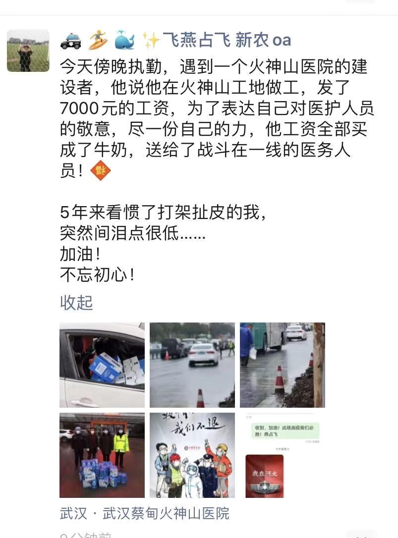 2月6日晚蔡甸火神山医院警务室民警燕占飞的一条朋友圈感动了所有人一切都源自他执勤时的一幕……