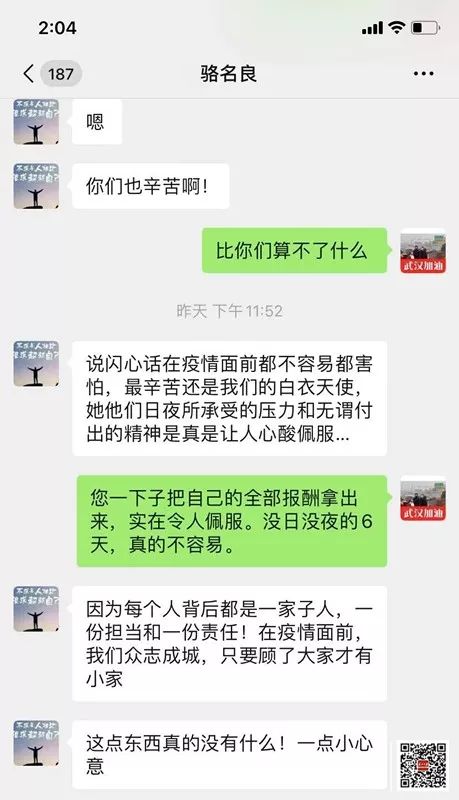 “同志,您有没有医院的联系方式?”车上下来一名男子,自称这些天一直在火神山工地做事,车上的营养品是他用刚发的工钱买的,想捐给医护人员补补身体。