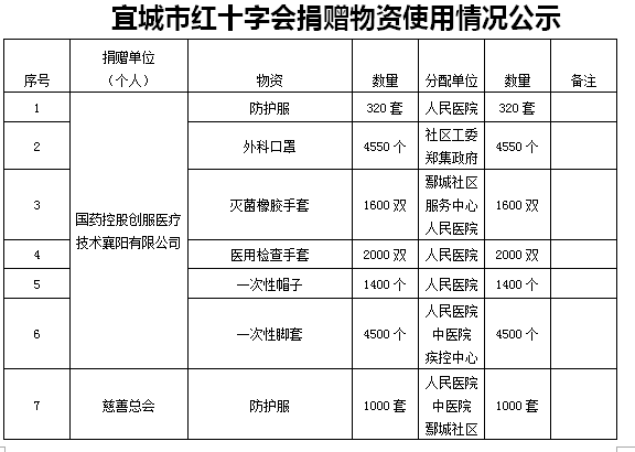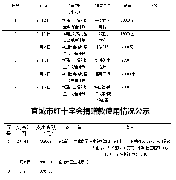 自新型冠状病毒感染的肺炎疫情发生以来,社会各界纷纷踊跃捐款捐物,积极支持宜城疫情防控工作,体现了社会大爱和守望相助的精神。2月5日下午18时至2月7日上午10时宜城市红十字会共接受社会各界爱心企业人士捐赠的抗击新型冠状病毒感染的肺炎专项资金201102元,截至2月7日上午10时累计接受捐款3292604元。