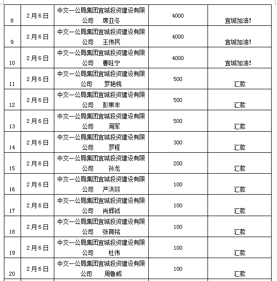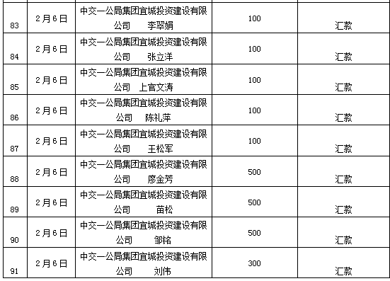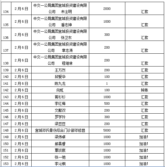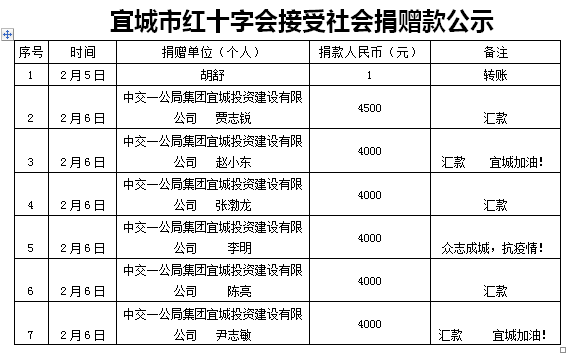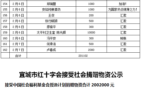 市红十字会本着公开、透明、高效的原则,24小时为各界爱心人士服务,所接受的款物交由市防控指挥部统一调配使用,欢迎社会各界进行监督。现将第五期(2月5日下午18时至2月7日上午10时)捐赠公示如下: