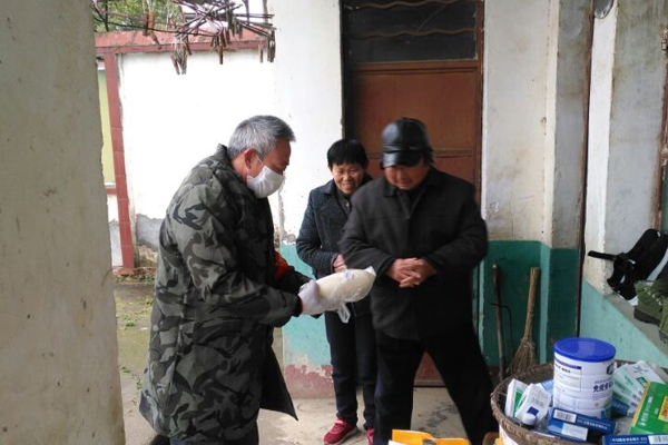 流水镇杨林片支部“红色暖心服务队”成员欧平俊为杨林小学年老体弱行动不便的退休老教师购送米、面条、萝卜、汤圆、佐料等生活用品。