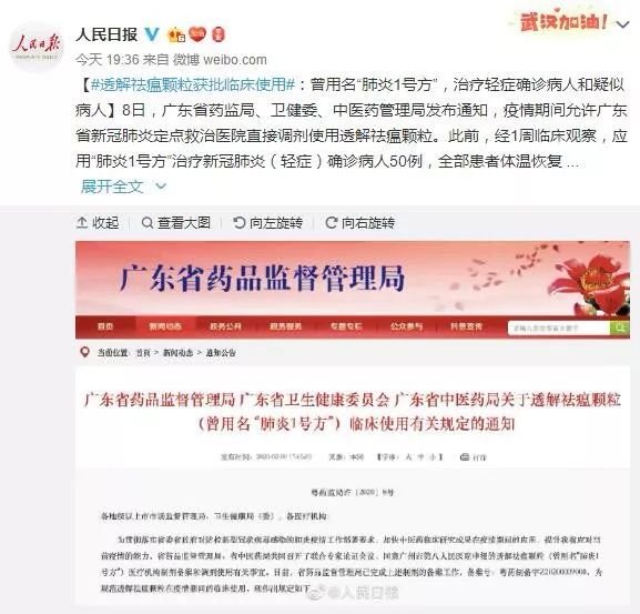 据人民日报消息,2月8日,广东省药监局、卫健委、中医药管理局发布通知,疫情期间允许广东省新冠肺炎定点救治医院直接调剂使用透解祛瘟颗粒。