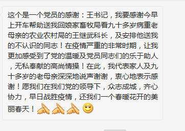 2月8日,正在小区进行防疫工作的党员王继武,突然收到一则住在8栋居民范秋耘的求助。原来范秋耘的母亲病重,但其在畜牧局院内居住,和子女们不在一起,亟需照看。得知这一消息的王继武立即向上级汇报,并协调车辆帮助范秋耘赶往照看母亲。