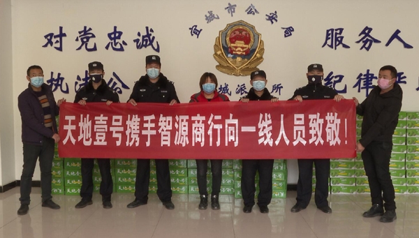 2月10日,智源商行总经理杨晶晶将500件天地一号苹果醋和蒙牛牛奶送一批生活物资送到市城管派出所、交警大队和南营派出所,对奋战在疫情防控一线的民警进行慰问。(向杰廷)