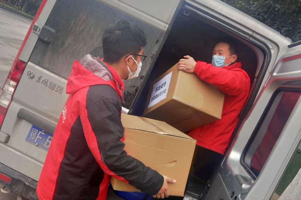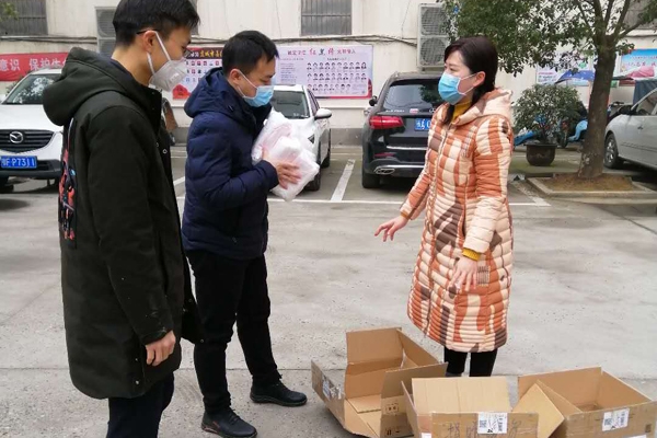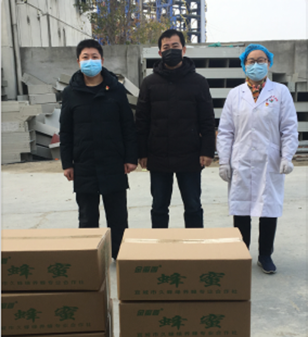 2月10日,市久蜂缘养蜂专业合作社理事长谭金涛把32箱蜂蜜捐赠给奋战在抗击新冠肺炎一线的市人民医院医务工作者。(王培建 陈富斌)