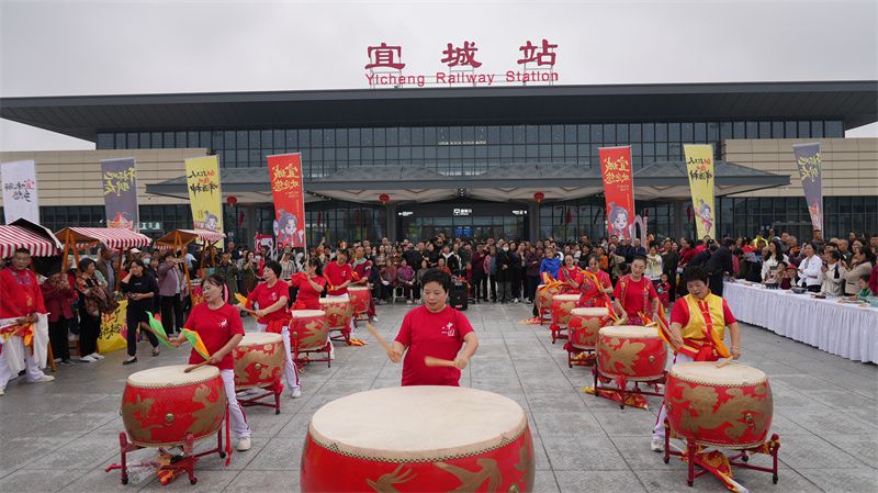 活动在庆祝高铁开通的非遗民俗展演中拉开帷幕。身着传统服饰的表演队伍依次登场,红绸翻飞的秧歌、灵动诙谐的旱船巡游、气势恢宏的荆楚鼓舞等节目轮番上演,营造出热烈喜庆的现场氛围。宜城市宋小玉文旅发展有限公司还设置了融合楚文化元素的主题打卡点,以文创展示与市民游客共同迎接高铁时代。