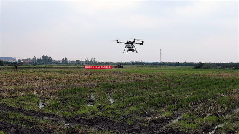 在完成播种的田块,后续管理也已跟上。不远处,一台植保无人机正在技术人员的操控下,按照既定施工路线,实现精准均匀施肥,不仅有效提升了生产效率,也节约了人工成本。
