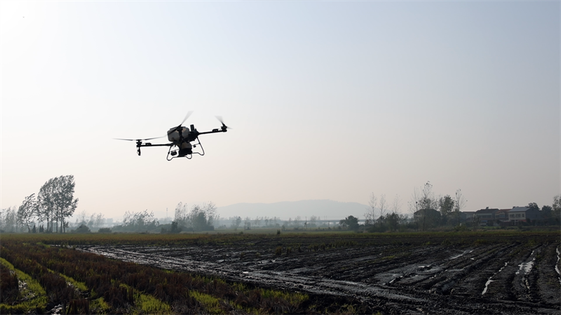 10月29日,在雷河镇官堰村油菜种植基地,农户们抢抓晴好天气播种油菜。与往年不同,今年当地农户选择无人机飞播方式进行播种。
