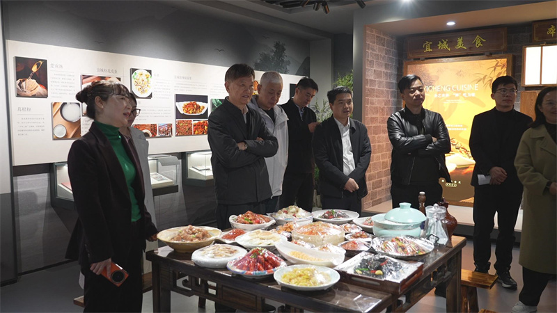 在楚都文化中心,调研组重点参观宜城市非遗展示馆。该馆以楚风建筑为特色,集中展出包括国家级非遗“襄阳花鼓戏”在内的1项国家级、5项省级、15项市级及84项县级非遗项目,涵盖传统戏剧、舞蹈、技艺、民俗及美食文化等多个门类。调研组对宜城构建的四级非遗保护体系及其活态传承成果给予高度评价。