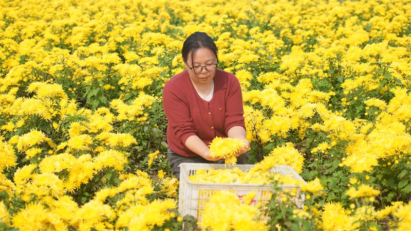 菊花产业的蓬勃发展,也为周边村民创造大量就近就业的机会。正在基地采摘的村民冯德翠说:“我一天能采近百斤,能挣100多块钱,比外出打工自在多了。”