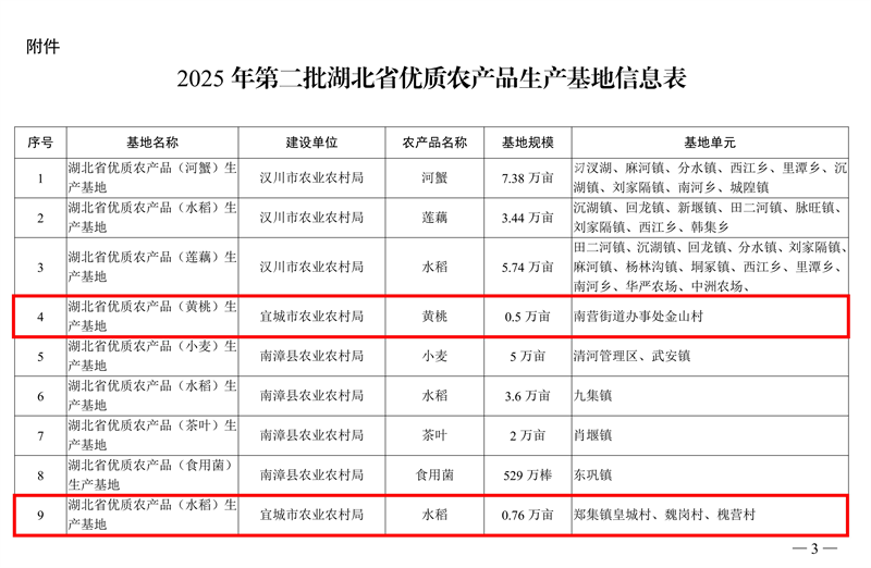 记者刘毅 通讯员邱妮娜报道:近日,湖北省农业农村厅公布2025年第二批省优质农产品生产基地名单,宜城市申报的“湖北省优质农产品(黄桃)生产基地”和“湖北省优质农产品(水稻)生产基地”成功入选,为宜城现代农业高质量发展再添两张省级“金名片”。