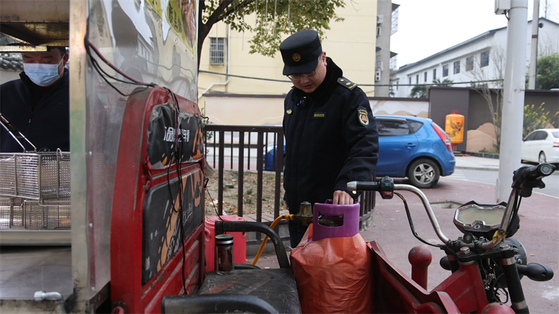 “老板你好,请问你们做生意出摊的时候燃气三件套都备的有吗?”傍晚时分,楚都美食街区灯火通明,香气四溢。城管队员们穿梭在各个摊位之间,重点对商户燃气安全设备配备、噪音管控等情况进行细致检查。对于检查中发现的问题,队员们当场督促整改,引导商户自觉维护街区秩序。