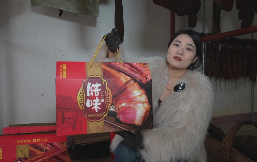 冬日的新垱村九组,空气中萦绕着淡淡的栎树熏香。陈梦玲的院子里,一排排腊肉、香肠色泽金红、油润透亮,正接受着传统慢火的熏制。展示厅内,她忙着将熏好的五花肉、香肠、兔肉等分装、打包,准备发往外地。“最近半个月,已经卖出去5000多斤了。”她笑着说道。