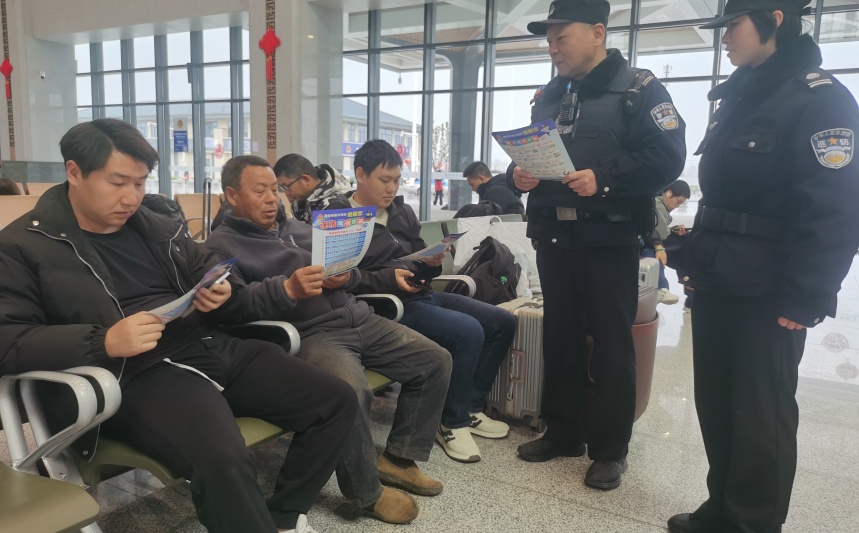 候车大厅里,安全宣传同样不缺席。民警利用旅客候车间隙,通过发放宣传单、现场讲解等形式,广泛开展反诈、防盗及禁带物品知识宣传。结合真实案例,重点向老年人、返校学生和外出务工人员揭露常见骗局,提醒大家守好“钱袋子”,平安踏上归途。