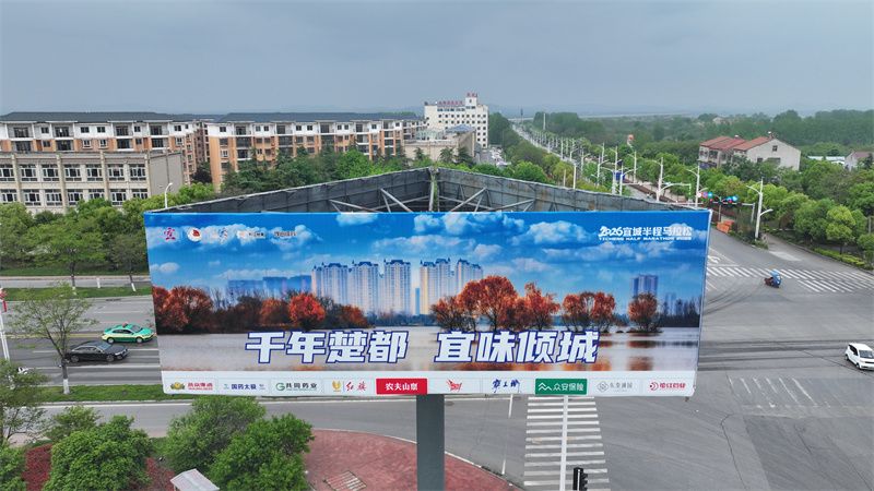 在宜城大道、襄沙大道等城区主干道,公交站台灯箱统一换上赛事主题海报,道路两旁挂上国旗,浓厚的赛事氛围与春日街景相映成趣。城区多处户外大屏播放赛事美景大片,画面中展示靓丽的城市风景,“千年楚都 宜味倾城”“4月26日 激情开跑”等标语格外醒目,引得路人驻足拍照。
