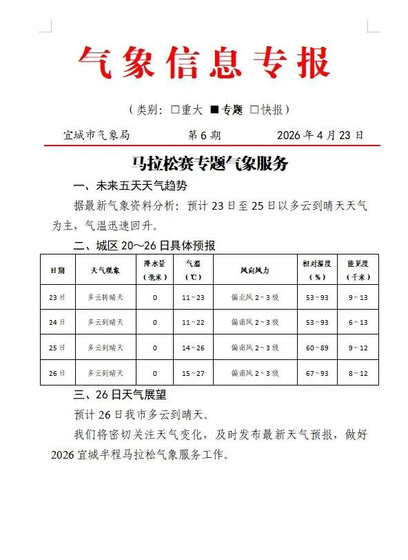 天气预报 | 2026宜城半程马拉松开赛倒计时3天!