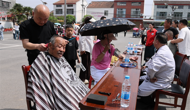 文艺演出掌声未落,广场另一侧的流动新时代文明实践集市便热闹开市。南营街道整合公安、卫生等部门资源和社会力量,设置健康义诊、义剪、禁毒宣传等服务摊位,精准回应村民日常需求。医护人员为村民免费测量血压、血糖,发放慢性病防治手册;公安民警现场宣传禁毒知识,发放禁毒宣传单;义工为村民免费理发。各个摊位前人头攒动,受到热烈欢迎。